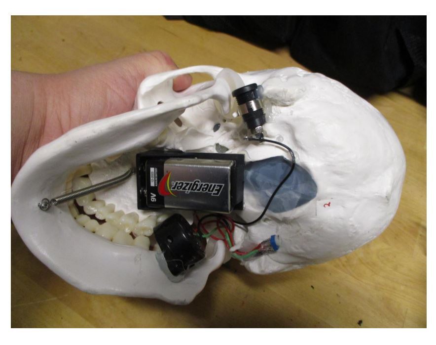 Photos of the skull show multiple wires connected to a battery affixed inside the item, along with a sensor and putty.
