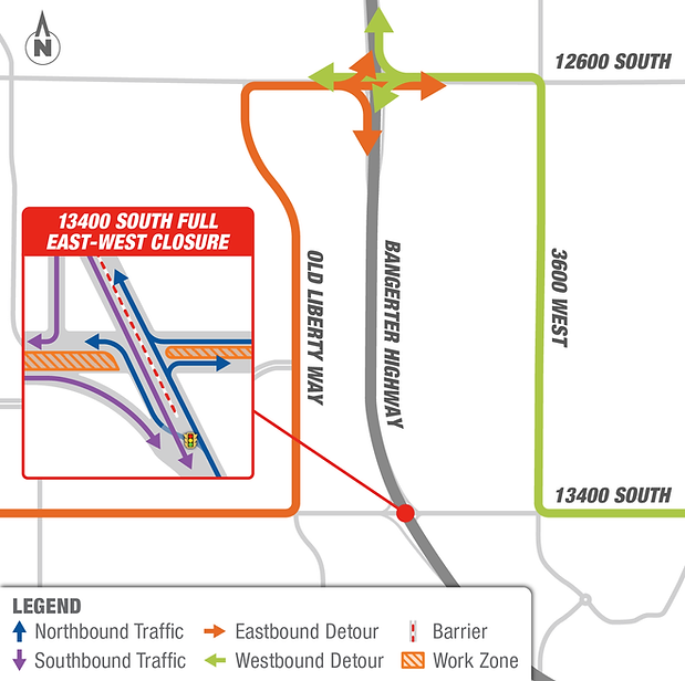 East and westbound travel at Bangerter Highway and 13400 South will be closed to all traffic to allow crews to construct a freestyle-style interchange that will remove stoplights at the location.