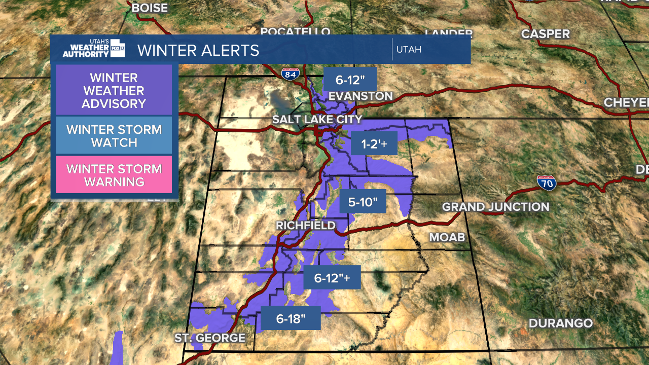 The Winter Weather Advisory kicks into effect for the central and southern mountains Tuesday afternoon, continuing through Wednesday evening. The central and southern mountains are forecast to receive 6-12 inches of snow with higher amounts around 18 inches at Brian Head.