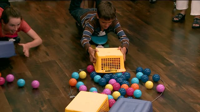 You will need: skate boards, plastic balls, small baskets and at least 4 people (2 laying on skate boards and 2 pushers)