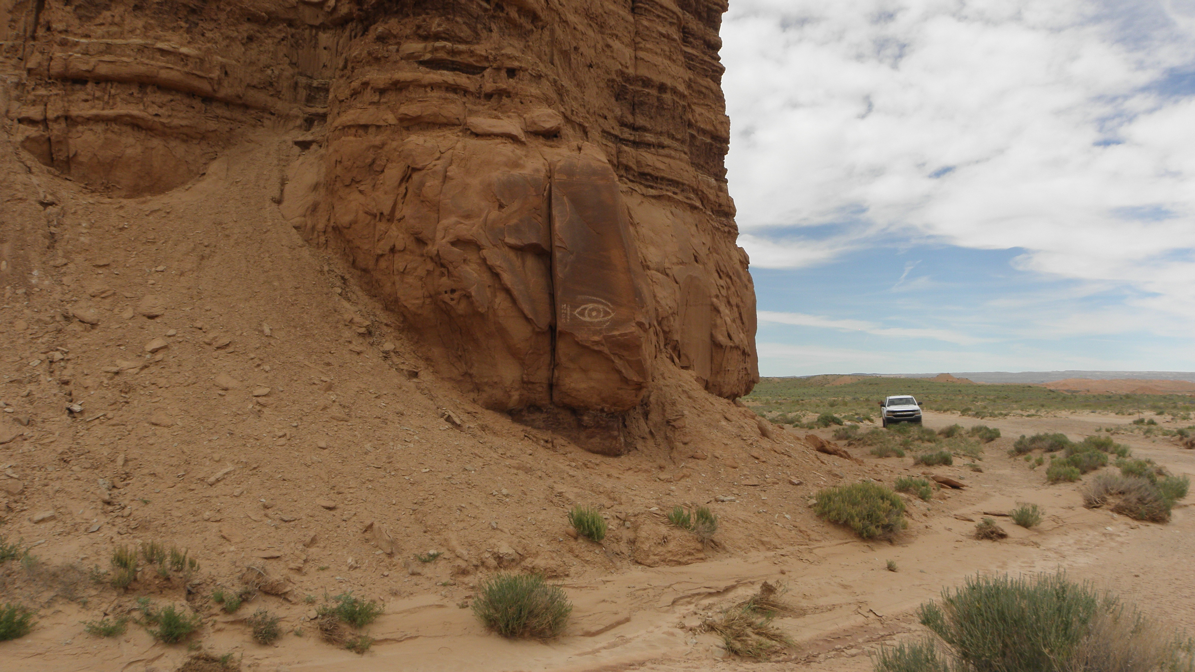 The park’s “Temple of the Moon” monolith was found vandalized with a 27.5-inch by 17-inch piece of graffiti in the shape of an eye. The letters MMGB appear vertically to the left of the eye.