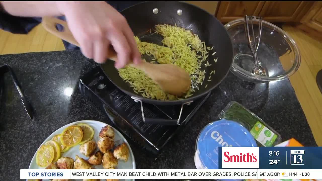To the same pan, add another tbsp. of olive oil and the butter. Once the butter is melted add the lemon slices and cook about 1 minute per side. Remove the lemons and place them with the meatballs. Add the garlic and orzo pasta to the same pan and cook and stir for 3-4 minutes or until the pasta starts to toast. Add the chicken broth and lemon juice and bring to a boil. Cook for 7-8 minutes or until the pasta is al dente.