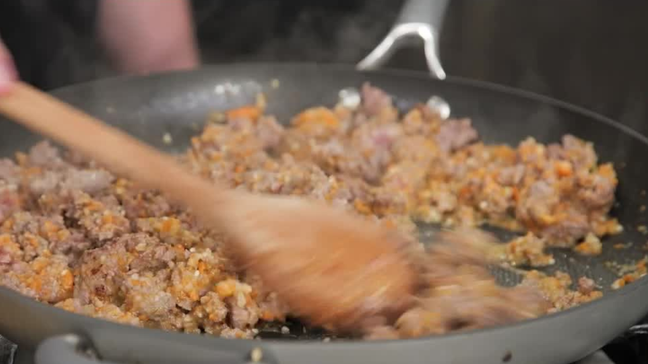 - Add the beef and sausage and crumble the meats as they brown. Drain any excess fat. Add the tomato paste and taco seasoning and cook a few more minutes. Add the broth and 2 c. of the marinara and bring to a simmer. Simmer 8-10 minuts.