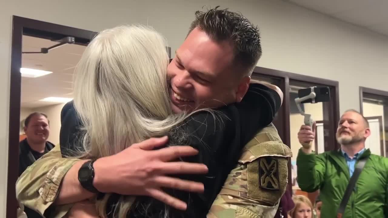 When Sgt. Kaleb Ah Loy, deployed since March in Iraq and Syria as part of a special unit with the Utah Army National Guard, came home earlier than expected, his first stop wasn't his house — it was Majestic Elementary Arts Academy to surprise his mom, DeAnn Blackburn.