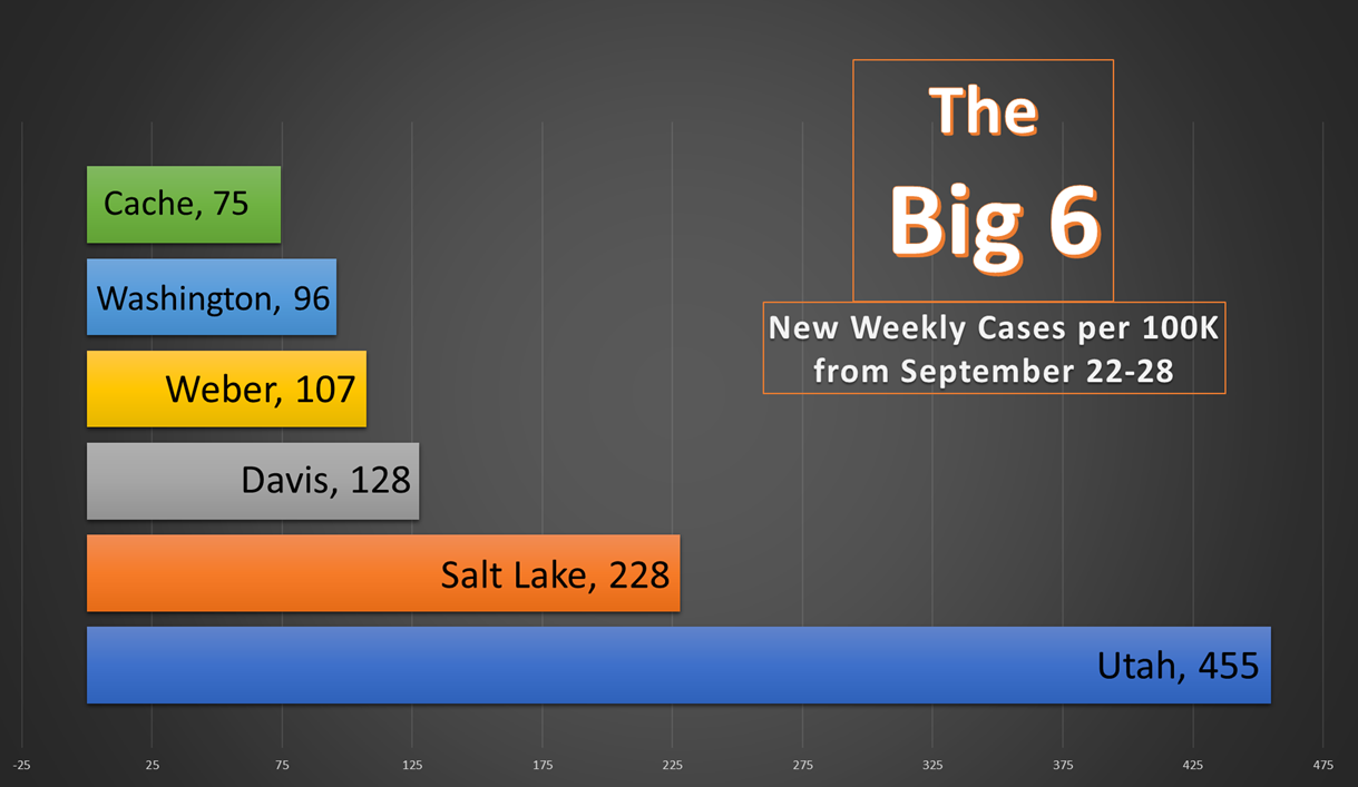 Because the Big 6 have enough people to make other statistics more meaningful, we also compare them to themselves each week with a “Big 6 Bounce” chart. The numbers in the chart below represent whether the county had a higher or lower infection rate from the previous week. Low numbers are good. It’s important for this chart to remember the number is about the improvement or decline of each county. For example: the negative 105 number for Cache County is fantastic, but they could only have such a low number because it had an extremely high number the previous week (180 cases per 100,000).