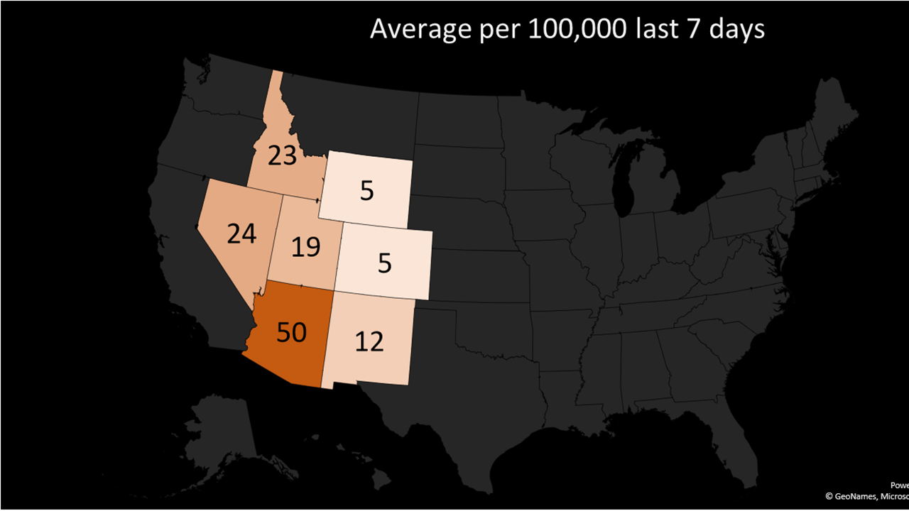 The chart below shows our current situation in relation to our neighbors. In recent days, our spike is far less severe than Arizona's, and Nevada and Idaho are seeing a sharper increase, but Utah's neighbors to the east have better numbers.