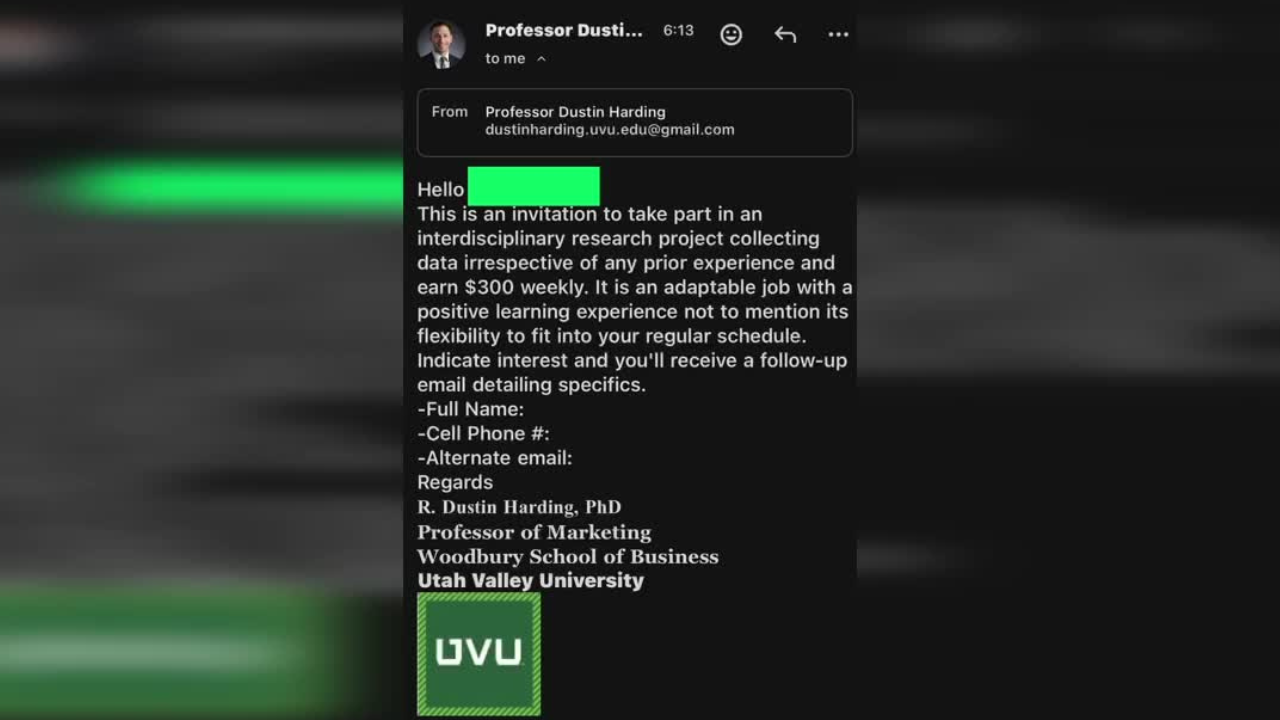 OREM, Utah — A new scam targeting local university students by impersonating their professors has found a victim at Utah Valley University, leading one of the professors involved to step in to support those who’ve been victimized.