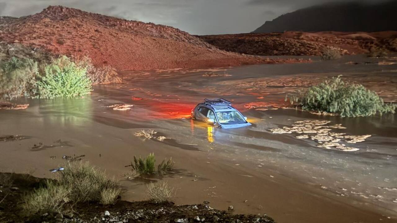 WASHINGTON, Utah — A driver and their dog had to be rescued Friday night after a vehicle was trapped by floodwaters near Washington City.