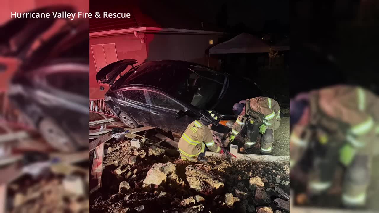 Hurricane Valley Fire & Rescue says that just before 11:00 p.m. Thursday, their crews were called to a reported vehicle accident where the car had left the roadway and struck a home.
