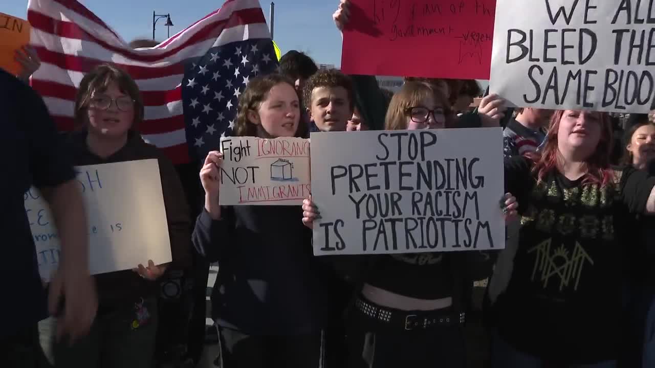 Students at Brighton High School held signs that read "No Secret Police" and "Trust Your Eyes, Not Their Lies" during the event, which ended after about an hour.