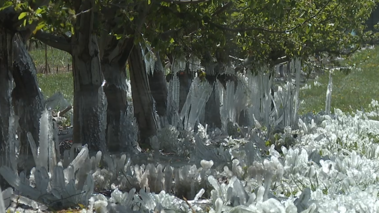 ALPINE, Utah — A glance at Burgess Orchards, with its grounds encased in ice, might suggest a crop lost to the overnight chill. However, the frozen layer is an intentional measure to protect the fruit.