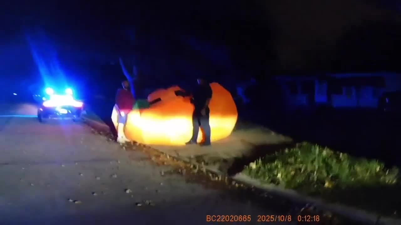 “I’ve never seen that before,” an officer can be heard saying of the inflatable Halloween decoration packed tight in the backseat.