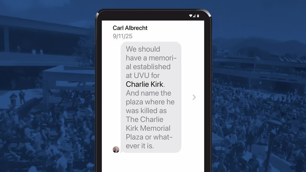 State Rep. Carl Albrecht (R-Richfield) texted Peterson the day after the shooting, writing, “We should have a memorial established at UVU for Charlie Kirk. And name the plaza where he was killed as the Charlie Kirk Memorial Plaza.”