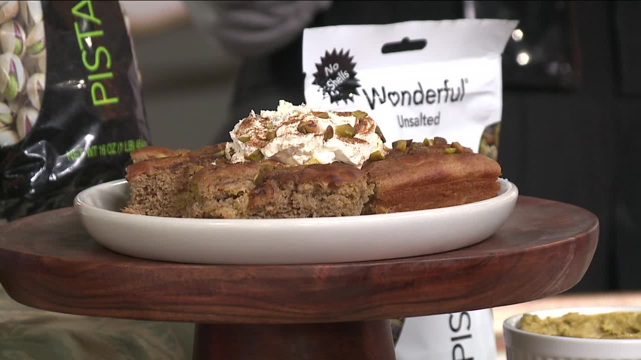 Pistachio Cinnamon Swirl Sheet Pan Pancakes provide a good source of plant protein and fiber.