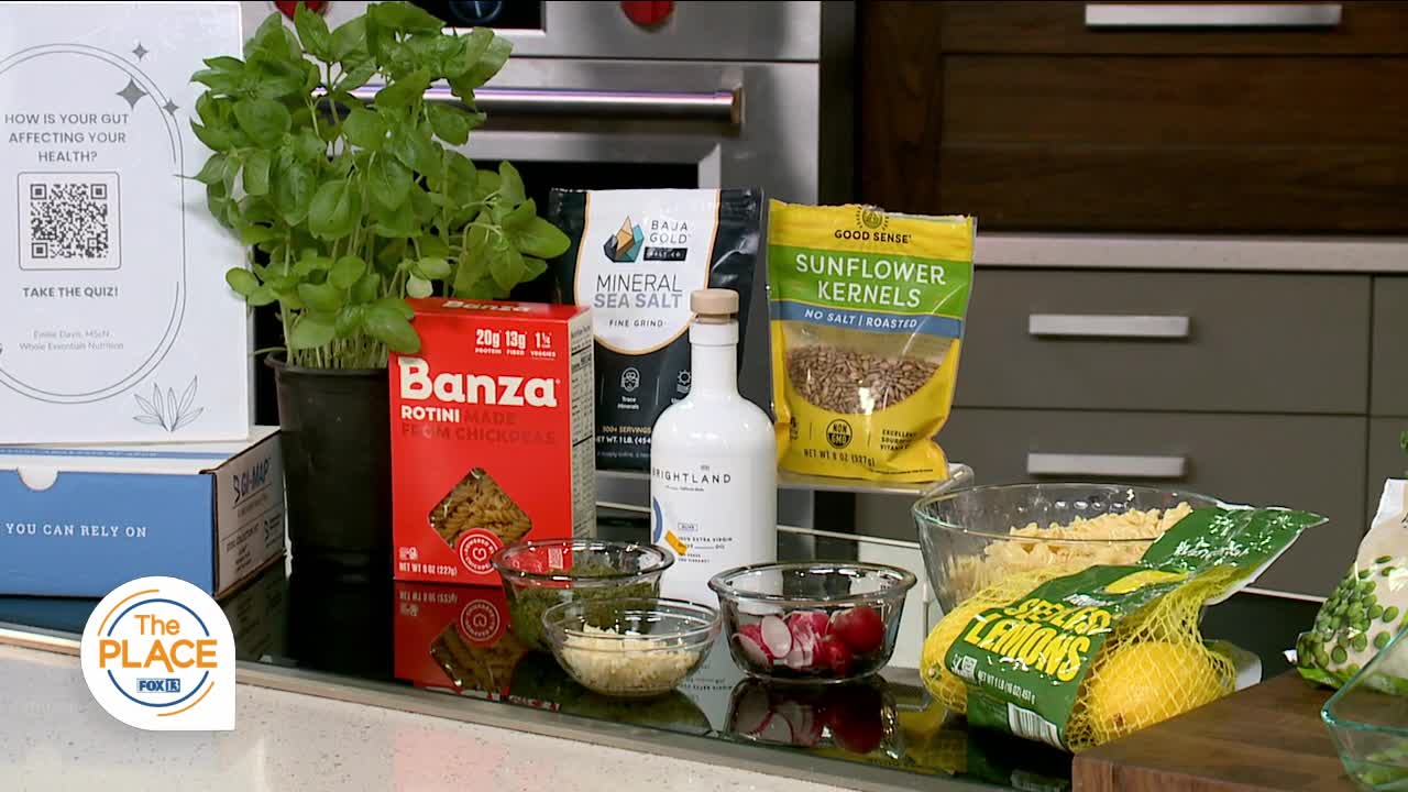 And Emilie is sharing a recipe for Spring Veggie Pasta Salad with brown rice pasta, peas, asparagus, and pesto sauce with fresh herbs for gut-friendly fiber and plant diversity.