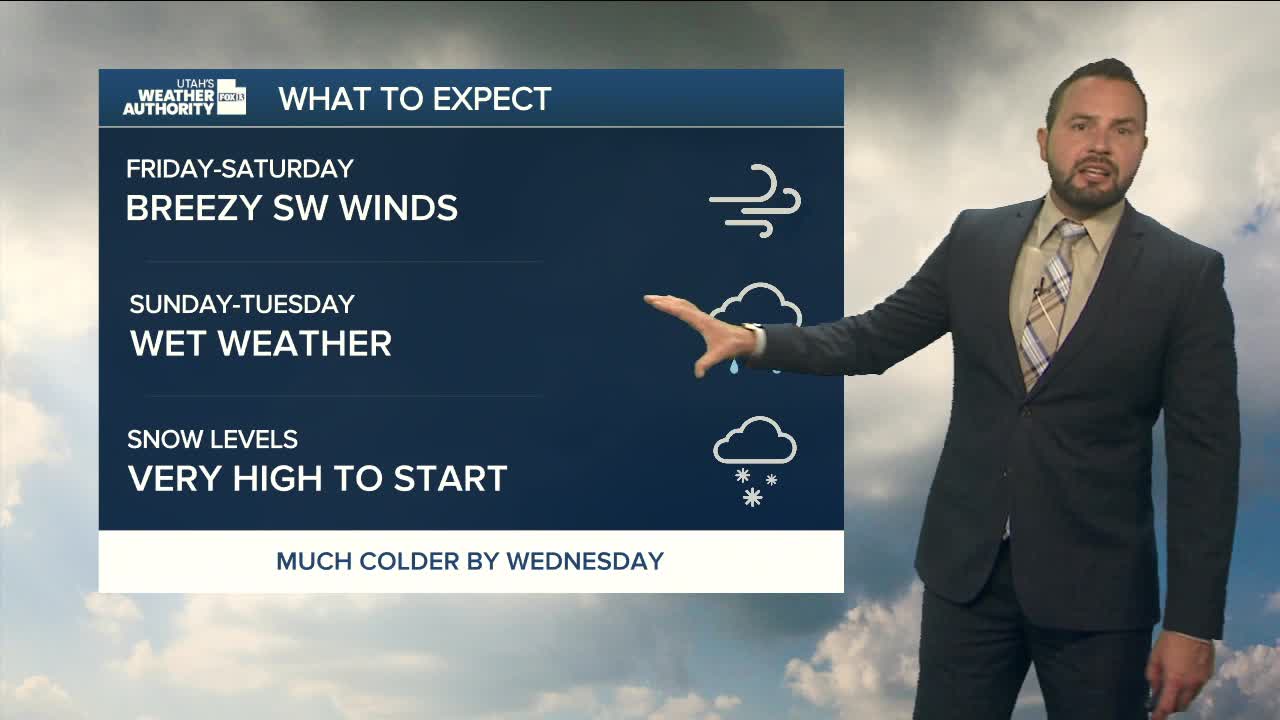 Most of the action hits the southern mountains late Saturday into Sunday. Snow levels start high (around 9,500–10,000 feet) before dropping to roughly 7,500–8,000 feet by Sunday night. The heaviest snow comes Sunday morning through Sunday night, with 5–10 inches above 9,000 feet and up to a foot around Brian Head and the Tushars. Mid-elevation zones can expect 2–5 inches.