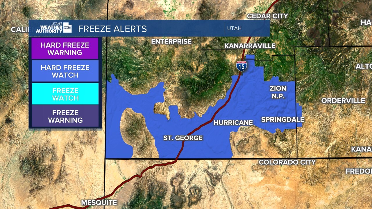 The National Weather Service said a Hard Freeze Watch will begin for areas of southwest Utah on Thursday night, including lower Washington County and Zion National Park. Sub-freezing temperatures as low as 25 degrees are possible through Friday morning.