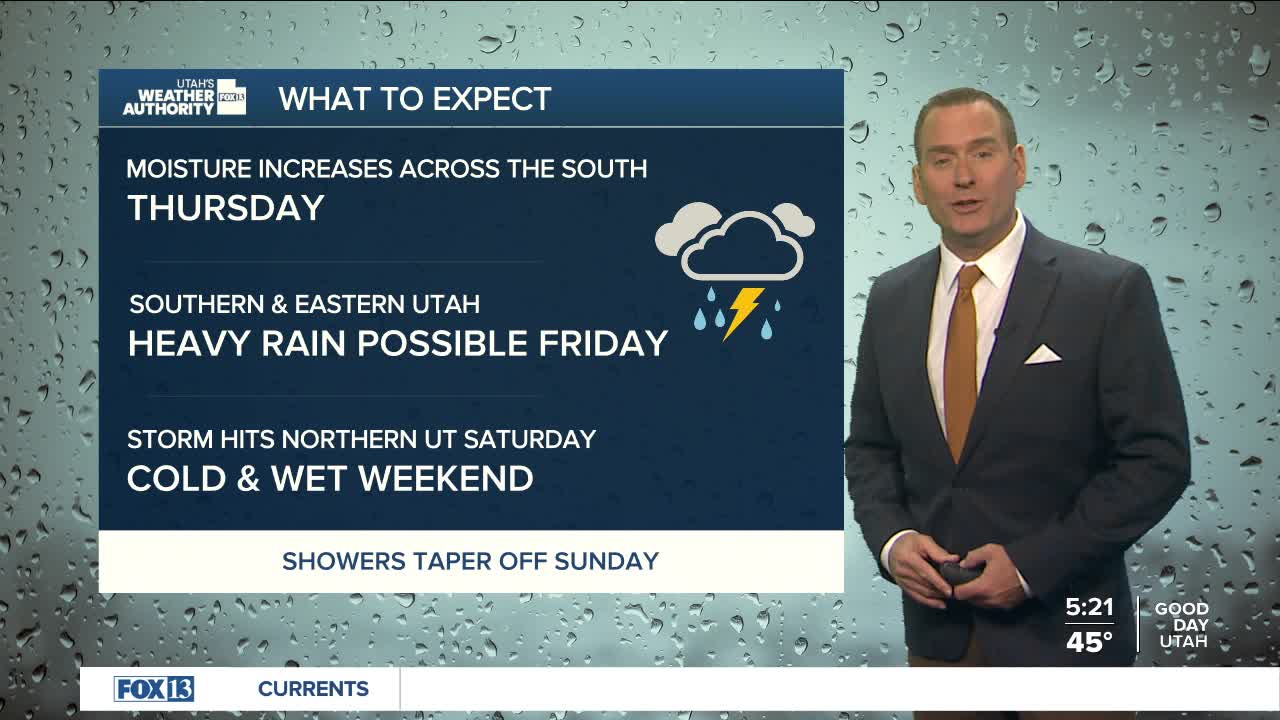 Sunny & warmer today & tomorrow. Moisture moves back into the south Thursday, then becomes widespread by Friday. Another storm will bring colder, wet weather across the area this weekend.
