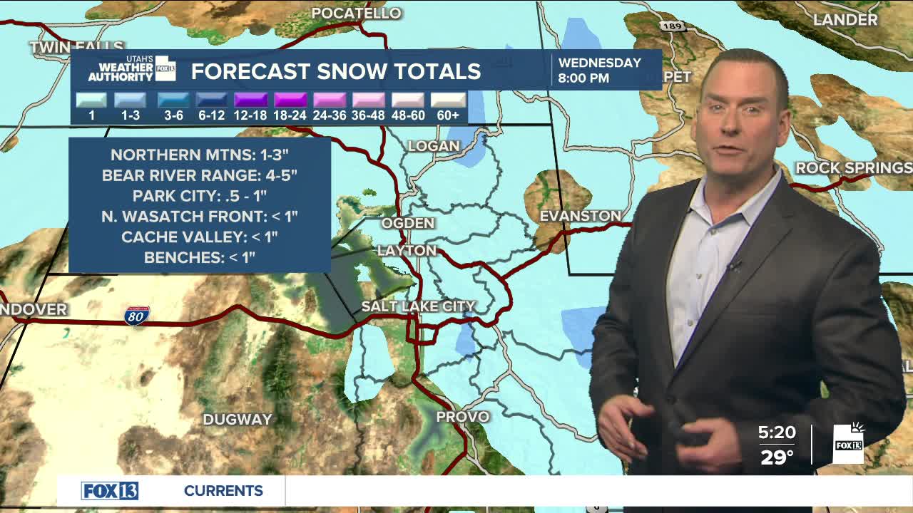 There's a chance of measurable snowfall (at least 0.1") along the northern Wasatch Front, Cache Valley, and the benches. There could be around a half-inch along the Wasatch Back in places like Park City, while the Salt Lake Valley will likely just get flurries.