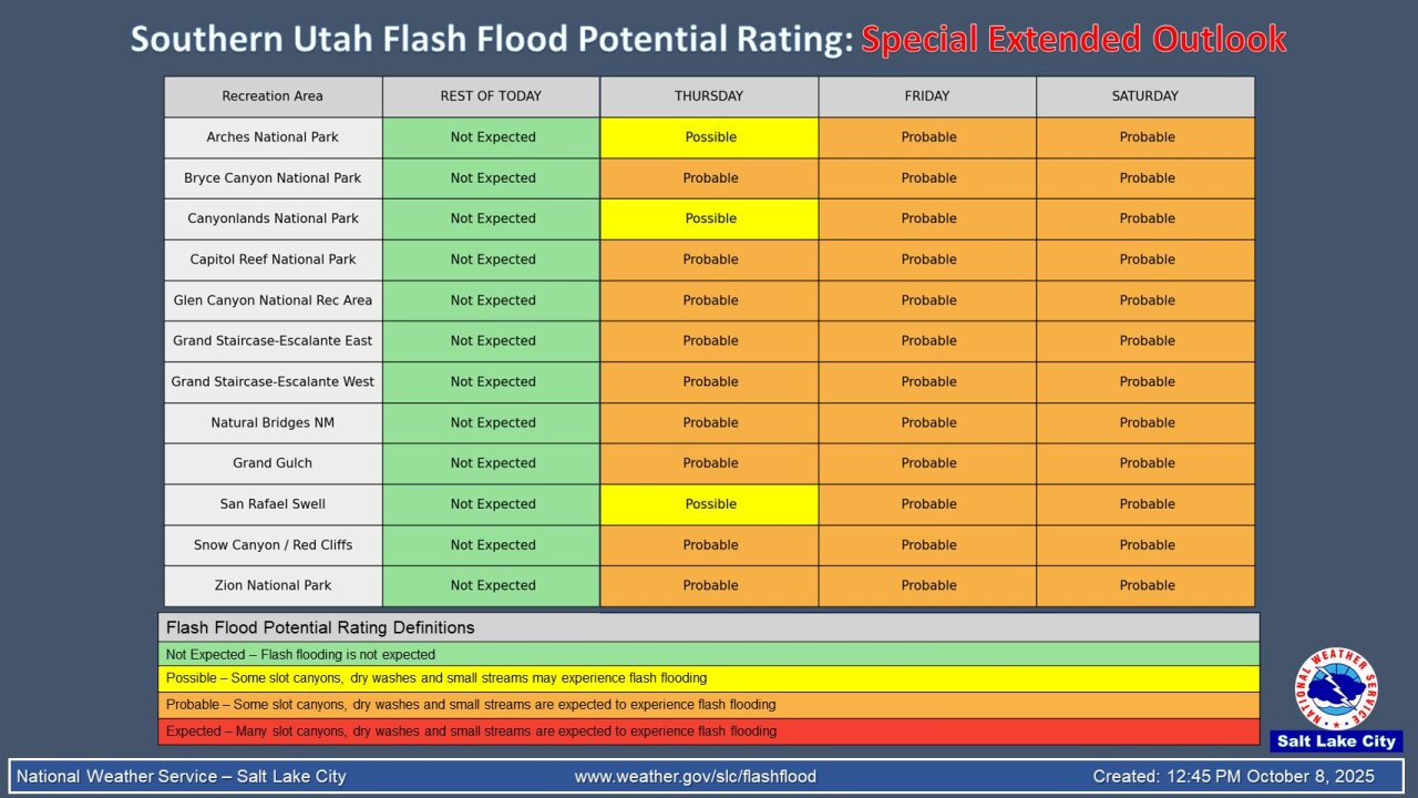 The National Weather Service issued an outlook showing "probable" flash flood potential for nearly all of southern Utah starting Thursday.