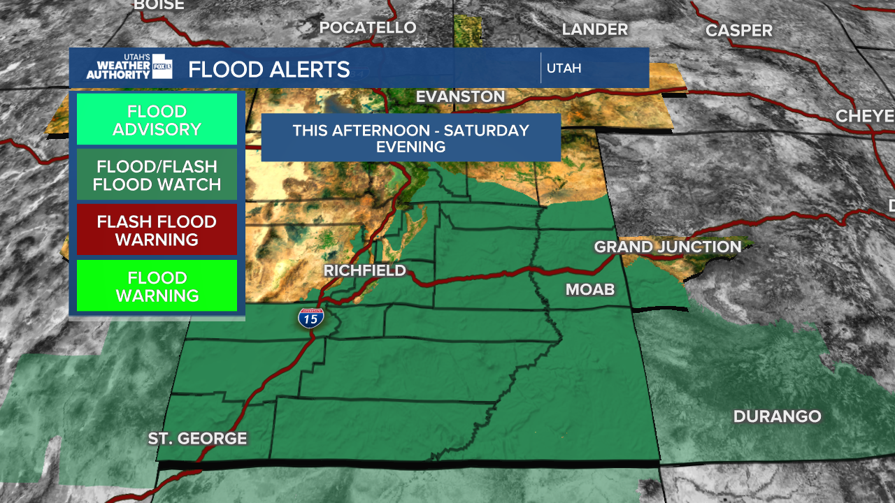 The storm front will begin to move into Utah late Thursday, with most areas under at least Flood Watch conditions through Saturday, although some watches extend into Sunday.