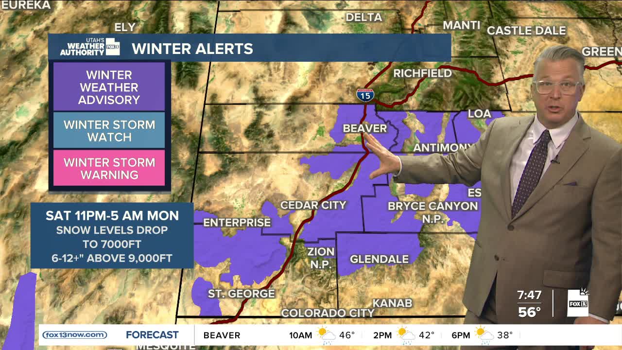 Two storms on tap over the next few days. The first storm moving in on Sunday with an initial impact for southern Utah and then showers moving north for Sunday afternoon. Rain in the valleys and mountain snow is expected. Temperatures remain above average with the first storm.
