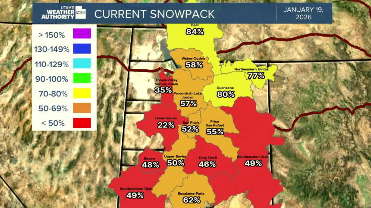 Snow provides about 95% of Utah’s water supply, and conditions are poor across every basin. All basins are below 80% of the median average, and half—mostly in central and southern Utah—are below 50%.